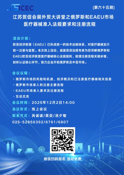 课程预告:江苏贸促会展外贸大讲堂第六十五期“俄罗斯和EAEU市场医疗器械准入法规要求和注册流程 ”